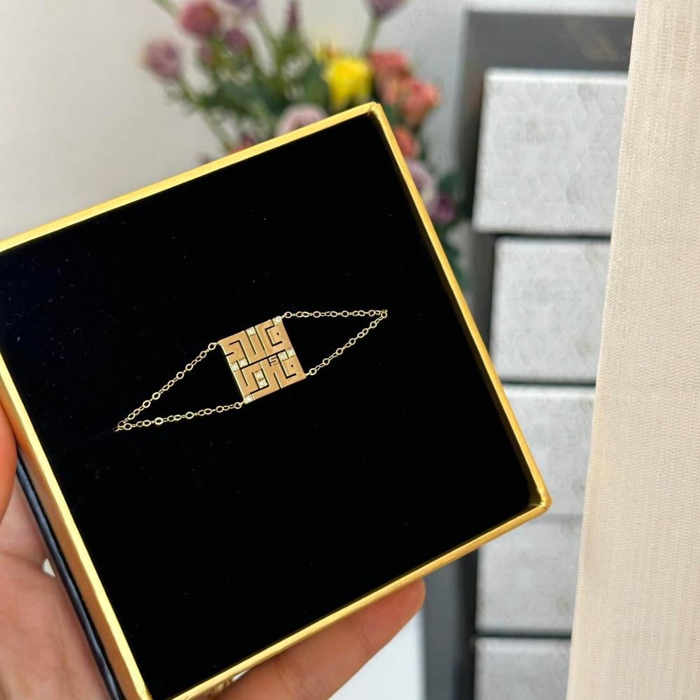 لا تفوتي فرصة اقتناء أسوارة يد ذهب "فإني قريب" ذات التصميم الكوفي الفريد، لتضفي على معصمك جمالاً خالدًا. الكمية محدودة، اطلبها الآن قبل نفاد المخزون.