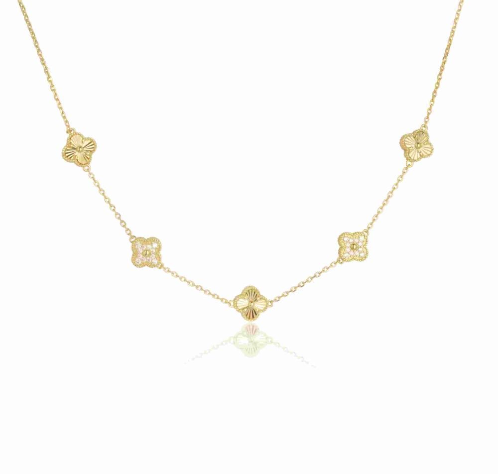 استمتعي بسحر الأناقة الكلاسيكية مع لمسة عصرية راقية مع سلسال فان كليف فضة خمس وردات بالحجر الملون من قليتر للمجوهرات .
